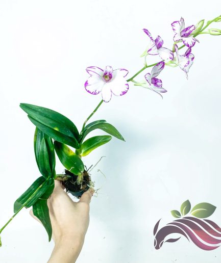 An epiphyte, it has a sympodial growth form. The flowers are borne on racemes and have white sepals and petals with purple streaks around the margin. The flower lip is white with purple streaks. This plant is a hybrid between Dendrobium Enobi Komachi and Dendrobium Laguna Princess.