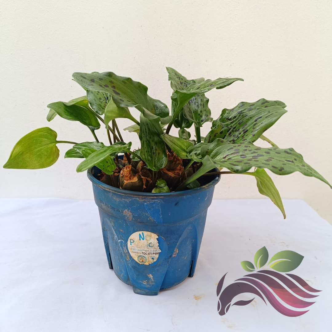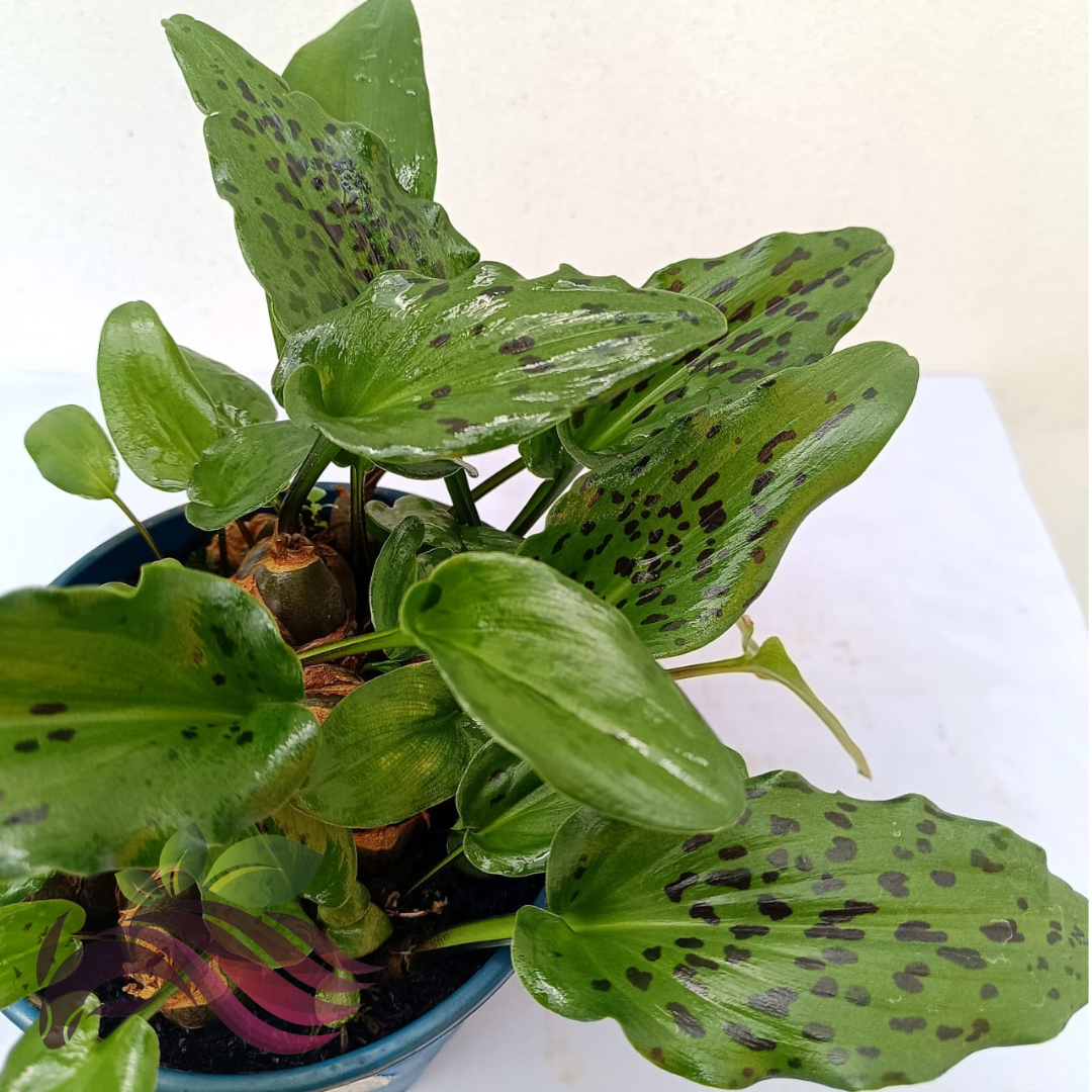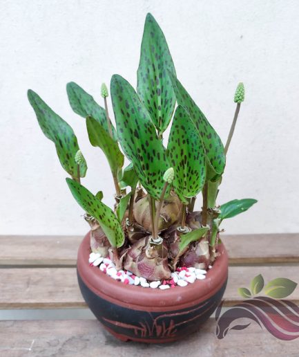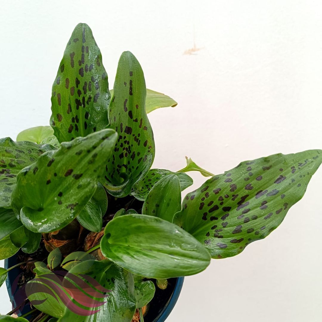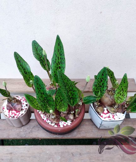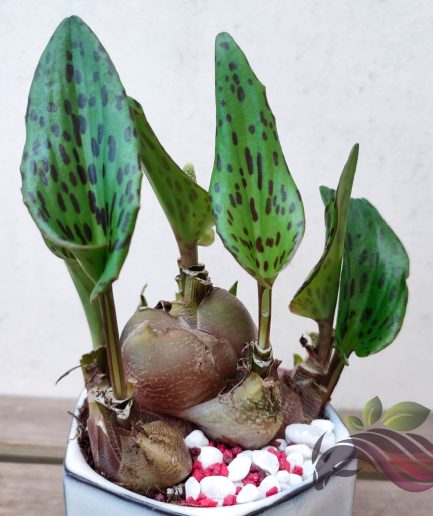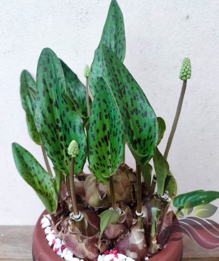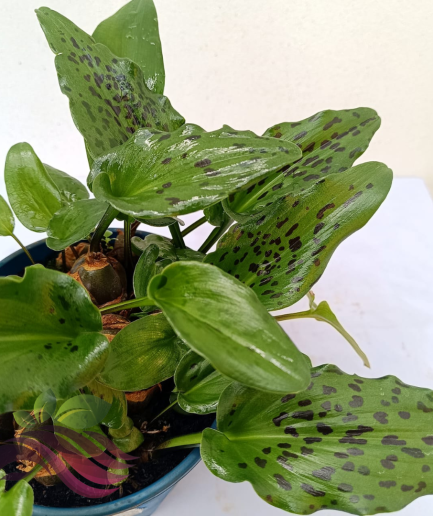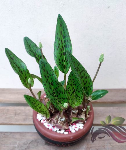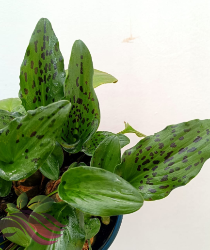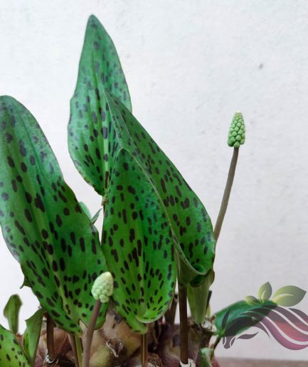 A bulbous perennial from South Africa where it is found under trees and on banks by streams. The shiny green leaves have wavy margins and sport black spots, reputedly more obvious in the sun. Spikes of tiny white flowers appear in early summer, hence one if its common names.