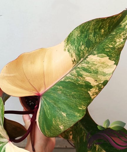 Philodendron ‘Strawberry Shake’ is a variegated hybrid climbing plant with large spade-shaped to triangular leaves, up to 1′ long and 5″ – 7″ inches wide, blotched with light yellow. New leaves are dark red and fade to a dark green with age, and the blotching shows tints of pink and orange.