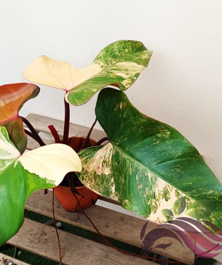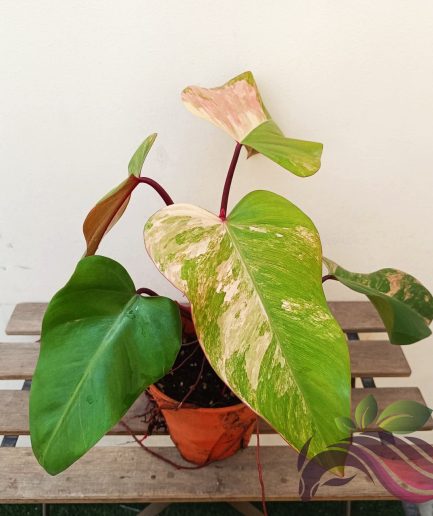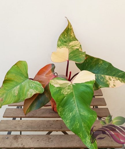 Philodendron Strawberry Shake is the variegated form of the popular variety ‘Red Emerald’. Color on the stems is usually dark red while the leaf coloration is usually green with a beautiful palette of variegation ranging from bright white to cream to pink to deep red.