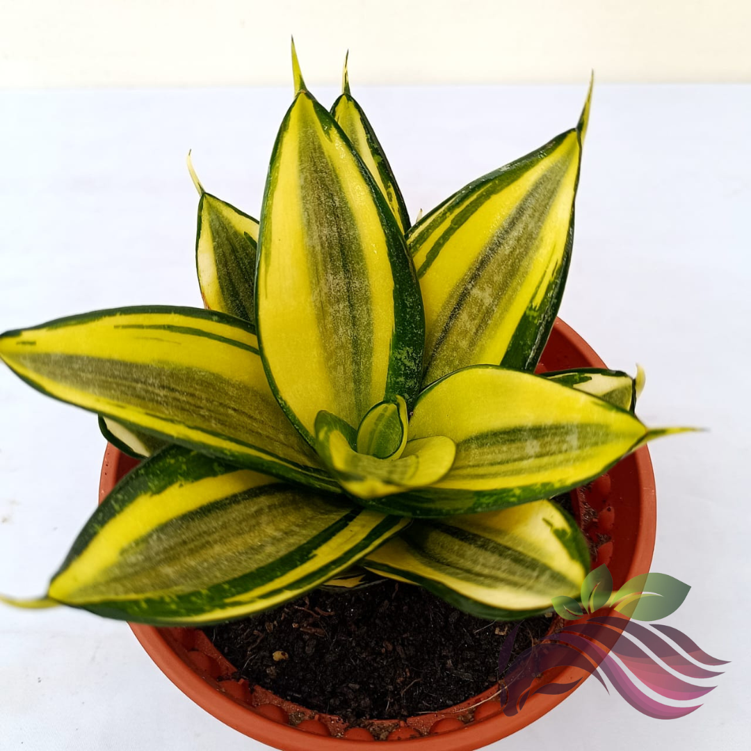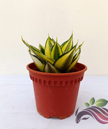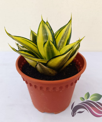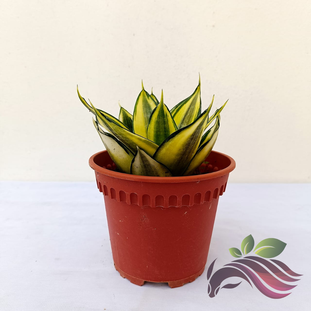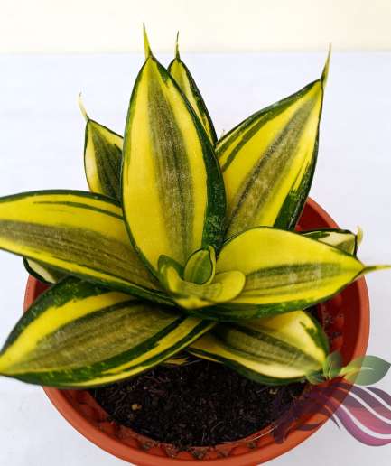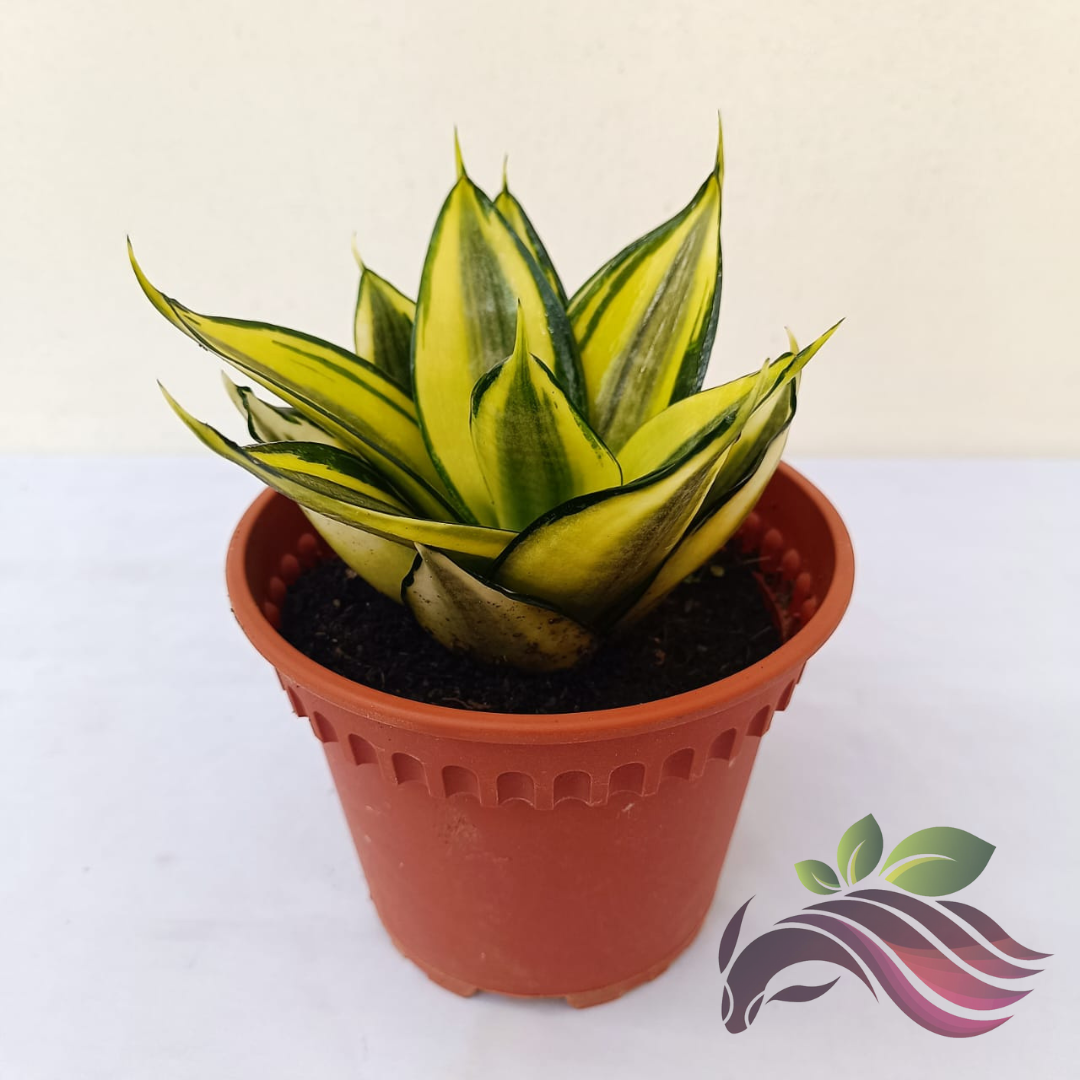 Sansevieria trifasciata ‘Golden Hahnii’ is a compact, dwarf cultivar of the snake plant, characterized by its low-growing, rosette-shaped habit, typically reaching only 15–20 cm tall. It features succulent, dark green leaves with striking longitudinal yellow margins. This easy-care plant is drought-tolerant, prefers bright, indirect light, and is a popular, air-purifying choice for small spaces or tabletops