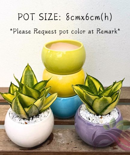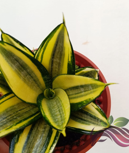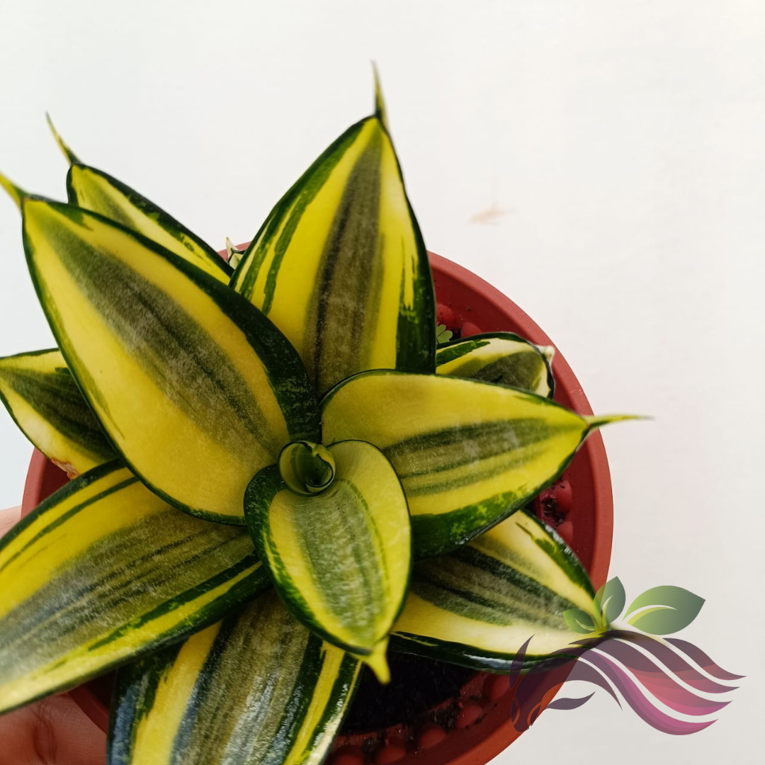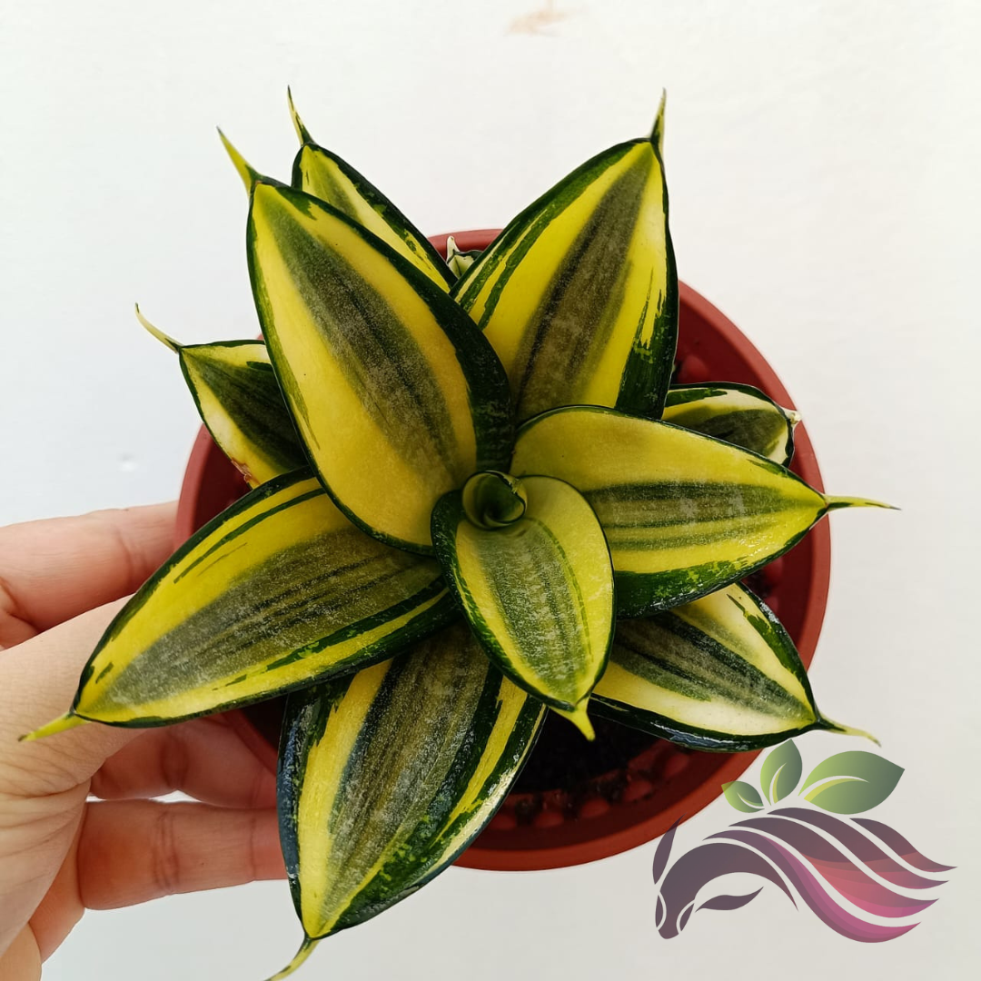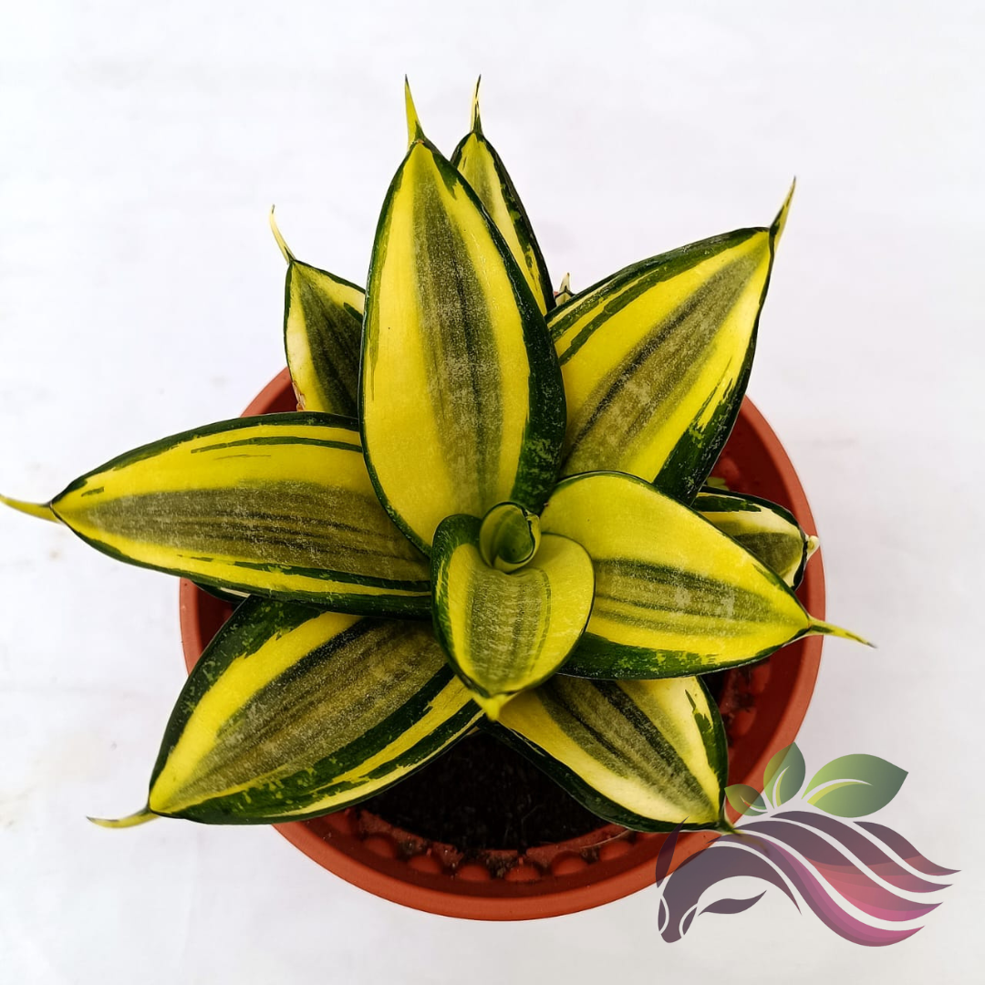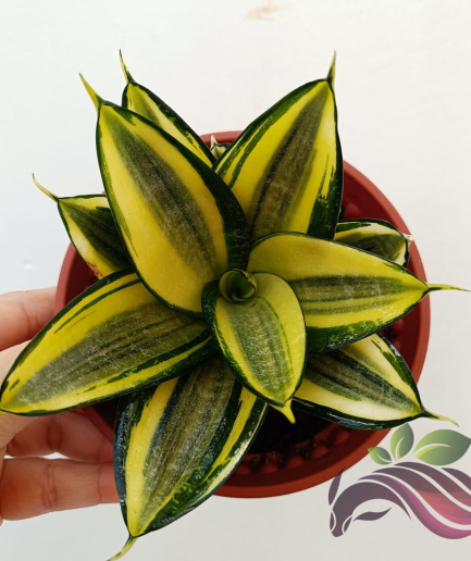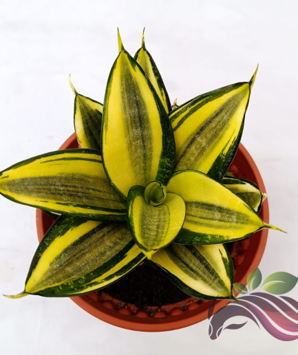 Sansevieria trifasciata ‘Golden Hahnii’ is a compact, dwarf cultivar of the snake plant, characterized by its low-growing, rosette-shaped habit, typically reaching only 15–20 cm tall. It features succulent, dark green leaves with striking longitudinal yellow margins. This easy-care plant is drought-tolerant, prefers bright, indirect light, and is a popular, air-purifying choice for small spaces or tabletops
